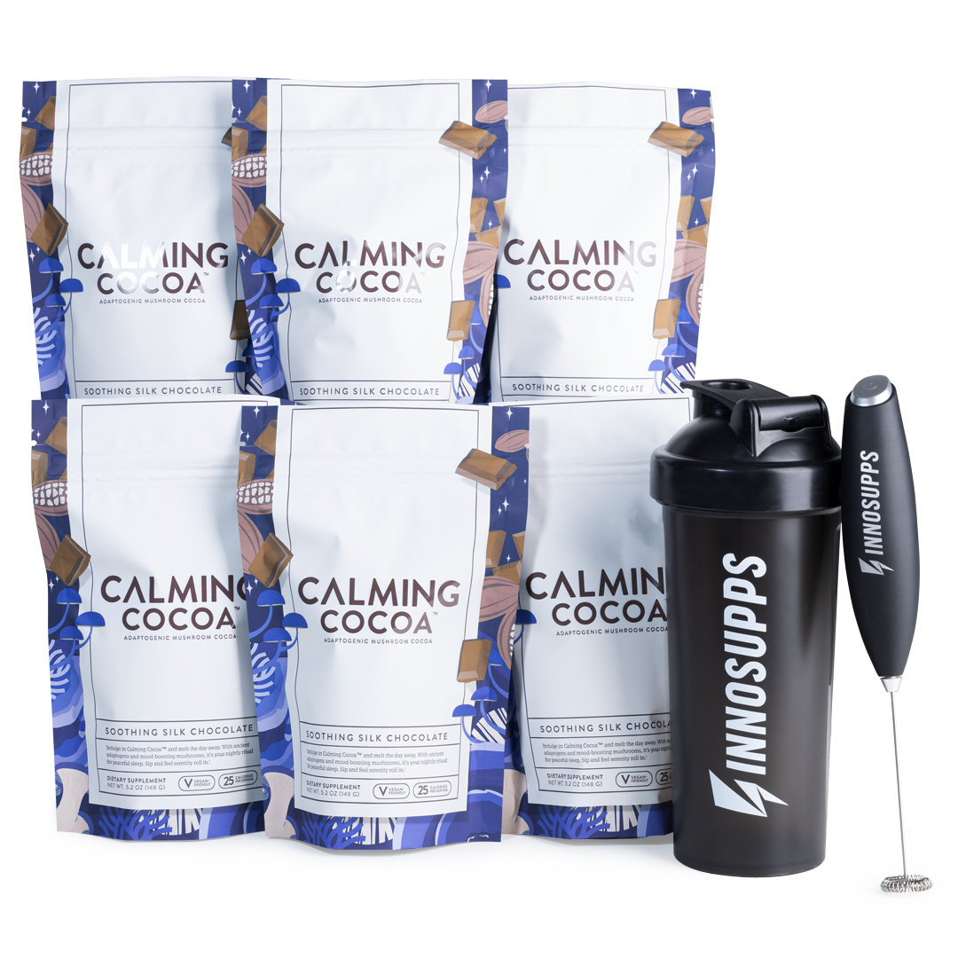 Calming Cocoa™ combines powerful adaptogens like Reishi, Cordyceps, Kava and L-theanine, which soothe your nervous system, quiet mental chatter, and guide you into deeper sleep cycles. These ingredients work together to support relaxation, balance stress and improve overall sleep quality.
