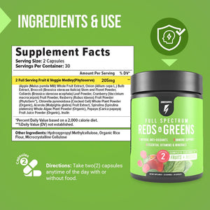 Full-Spectrum Reds + Greens will nourish your body with 2 full servings of fruits and vegetables coming from the superfood blend PhytoServ™. This nutrient powerhouse is a potent source of natural antioxidants to help supercharge the immune system from the harmful effects of oxidative stress.*