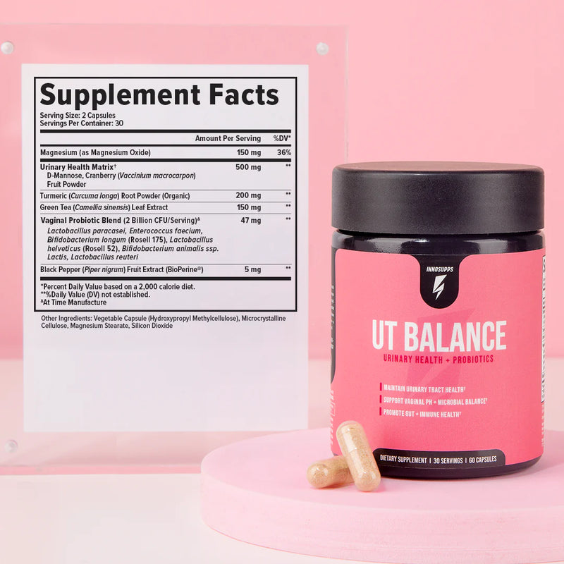 UT Balance combines a powerful blend of doctor-approved, female-focused ingredients, including a 2 Billion CFU Probiotic Blend, D-Mannose, Cranberry, Green Tea, Turmeric and Magnesium, to effectively support odor control, discomfort and maintain optimal pH balance.*