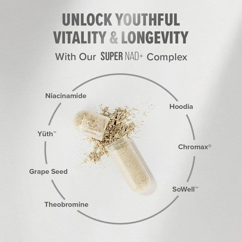 Super NAD+ is a 5-phase cellular optimization formula designed to restore NAD+ levels, enhance mitochondrial function and support healthier aging. It combines clinically supported ingredients like Niacinamide, Spermidine and Theobromine to promote energy, focus, metabolic health and visible skin renewal.*