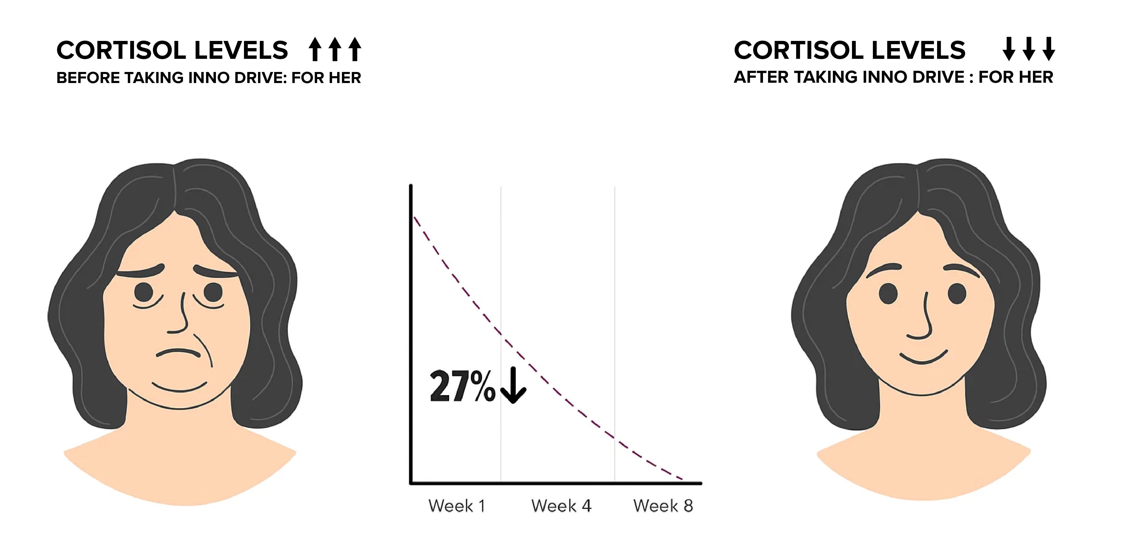 Inno Drive: For Her is packed with 15 science-backed ingredients that help reduce cortisol, the hormone behind facial puffiness, belly bloat, and stubborn weight gain.