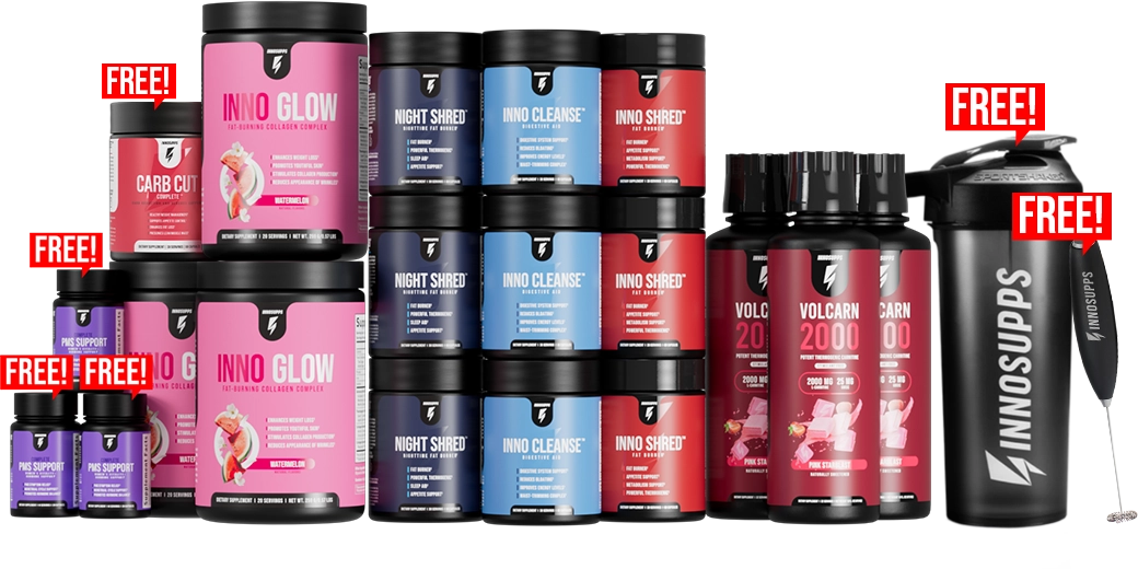 Inno Glow - Volcarn 2000 - Inno Shred - Night Shred - Inno Cleanse - Carb Cut Complete - Complete PMS Support - Shaker - Frother