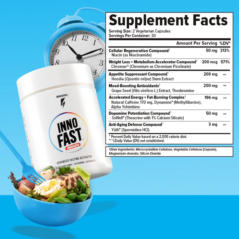 With Inno Fast, your fasting journey gets an incredible boost, so you can achieve extraordinary results in minimal time! By integrating Inno Fast into your fasting routine, you're not just getting a leaner, more shredded physique, but also reversing signs of aging, supercharging cognitive function, ramping up dopamine production, skyrocketing your energy levels, and much more. And, if you are new to intermittent fasting, Inno Fast will help curb cravings so you can practice your fast without the worry of lengthy starvation!*