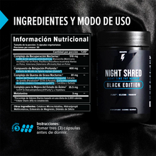 Night Shred Black Está formulado para ser natural, seguro y eficaz. Contiene ingredientes naturales, pero también es apto para veganos y no contiene OGM. Cada cápsula de Night Shred Black se fabrica en Estados Unidos con ingredientes de origen nacional e internacional en nuestras instalaciones de vanguardia, certificadas por las Buenas Prácticas de Manufactura (BPM), bajo los estándares más estrictos, precisos y estériles. Como siempre, si padeces alguna afección médica, te recomendamos consultar con tu médico.
