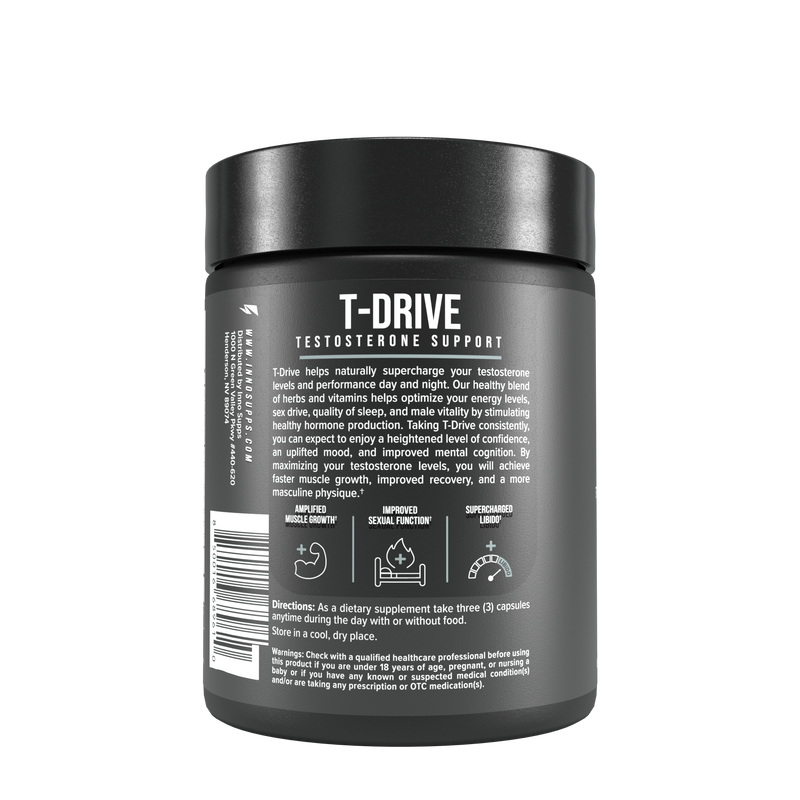 T-Drive contains key nutrients that are proven to stimulate and support healthy testosterone production, increase overall male vitality, and energy levels in the gym and in the bedroom (if you know what we mean ;).*